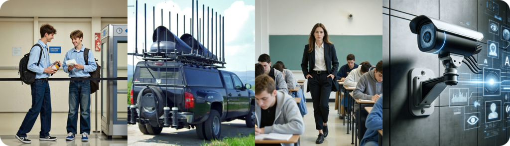 Modern high-security exam environments typically rely on multiple monitoring and restriction methods.